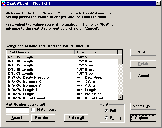 Step 1 of the Chart Wizard allows you to select one or more part numbers you want to analyze.