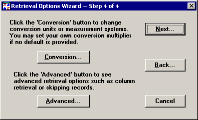 Step 4 of the Retrieval Options Wizard allows you to convert measurements from one unit to another and to select advanced retrieval options.