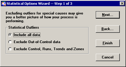 To select which method to use when assessing standard deviation, and which options to use for data that is normally and non-normally distributed, click Next to move to Statistical Options Wizard Step 2.