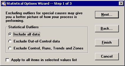 To apply the statistical outlier selection to all part numbers or Short Run process specifications that you selected on Chart Wizard Step 1, select the Apply to all items in selected values list check box.