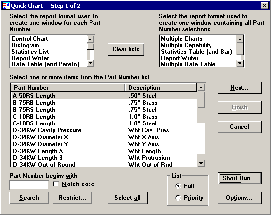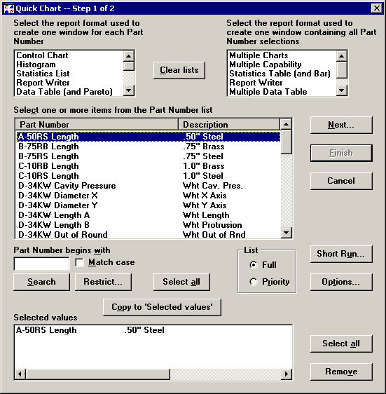 Using Mode 1, all of the retrieval parameters and statistical settings that you choose on Quick Chart Step 2 will apply to all of the part numbers or Short Run process specifications that you select on Quick Chart Step 1.