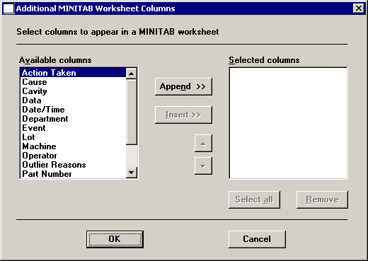 To add a value to the end of the list of Selected columns to be sent to MINITAB, double-click the value in the Available columns list.