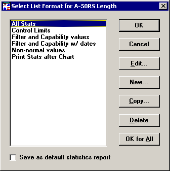 After entering a name for the statistics report format, click OK. Then select the statistics you want to include in this statistics report format. For more information, see Selecting the values to display on a Statistics List or Statistics Table .