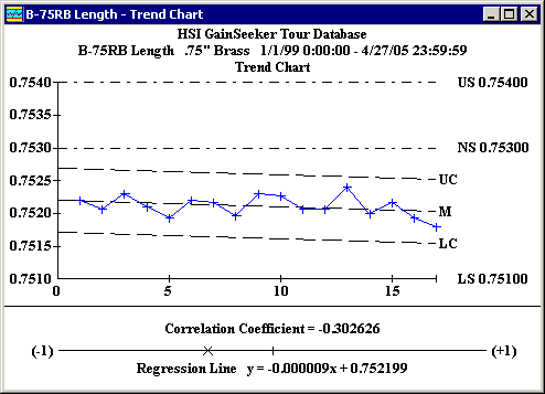 Like the Scatter Chart, the Trend Chart plots data points to detect trends. Both control limits and the mean are calculated from the linear regression line. By knowing the trend of a process, you can better predict when it will run outside gate limits or specifications.