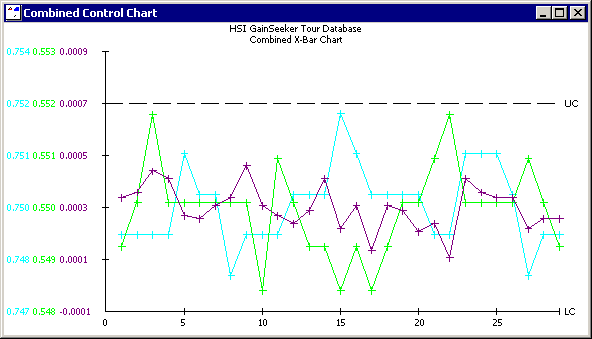 This chart allows you to compare the subgroup averages from multiple retrieval groups that share a similar combination of date/time stamp and/or traceability values that you select. You can also configure SPC to lump similar date/time stamps together (and define the maximum length of time to consider them "similar"), to compare specific traceability fields, or to sort data by traceability values instead of sorting by date/time stamps.