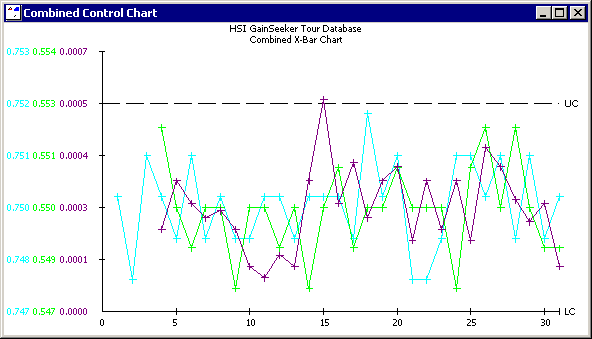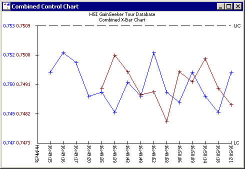 The retrieval groups in the following Combined Control Chart display several lots of a part that goes through one process (the blue line) and then goes through a second process (the red line). The data points are matched only by date/time stamp