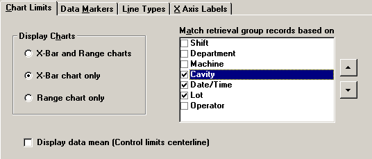 On the Chart Limits tab, select the check boxes for the traceability and date/time options to use for matching data from different retrievals. If you clear all the check boxes in this list, the data records from different retrieval groups will be matched by count (first subgroup retrieved for each retrieval group, second subgroup retrieved for each retrieval group, etc.).