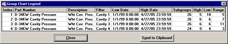 This tool uses one control chart to compare similar subprocesses that are running simultaneously. For example, the chart below compares data from four cavities on one machine. The X-Bar chart plots the low subgroup average and the high subgroup average at each common date/time stamp. The Range chart plots the subgroup range for the part number with the most variability. The Group Chart ignores all other subgroup averages and ranges.