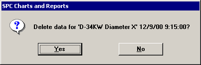 This option only functions correctly when you click a cell in a Data n, X-bar, Range, Sigma, or Moving Range column. It allows you to delete the subgroup on which you clicked.