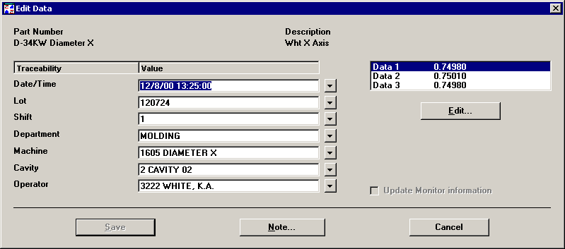 This option only functions correctly when you click a cell in a Data n, X-bar, Range, Sigma, or Moving Range column. It allows you to edit the note for the subgroup on which you clicked.