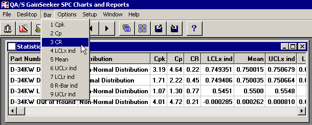 You can also display a Bar chart of any statistic shown on the Statistics Table. Make sure that the Statistics Table is the active (highlighted) chart, then click the Bar menu and select the statistic for which to create the chart.