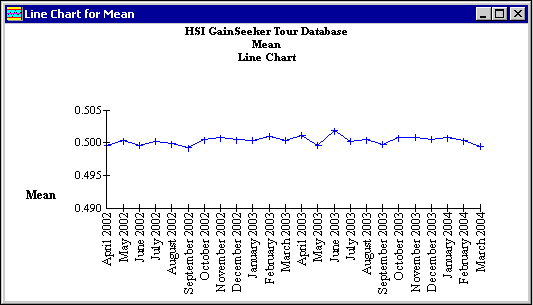 After generating a statistics table with rows in chronological order – for example, by using Chart Designer to create a report based on multiple date ranges – it is possible to draw a line chart of the consecutive values of one statistic from your table. For information, see Line chart for Statistics Table.