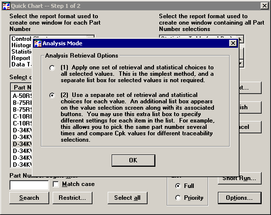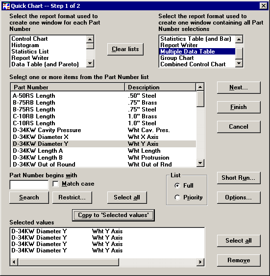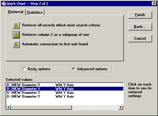 Click one or more standards in the Selected values list, and then select the retrieval options and statistical options you want to apply to the selected standards. For example, in the screen below, only the second instance of the "D-32KW Diameter Y" standard is set to Retrieve column 2 as a subgroup of one.