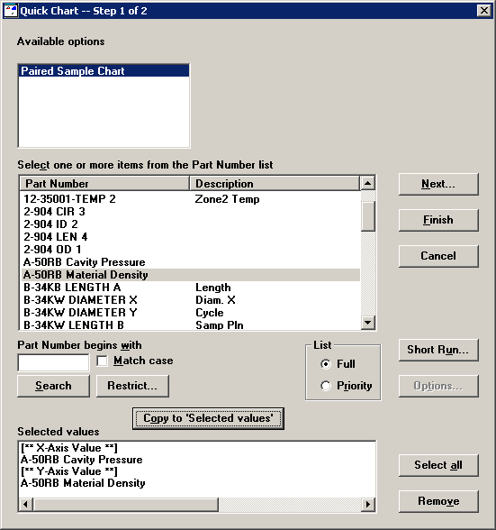In the Part Number list, find a standard you want to analyze on the Paired Sample chart. Double-click this standard, or highlight the standard and then click Copy to 'Selected values', to add this standard to the Selected values list. This first standard will be plotted along the x-axis of the chart.