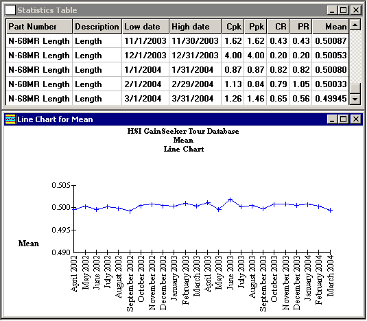 After generating a statistics table with rows in chronological order – for example, by using Chart Designer to create a report based on multiple date ranges – it is possible to draw a chart of the consecutive values of a statistic from your table.