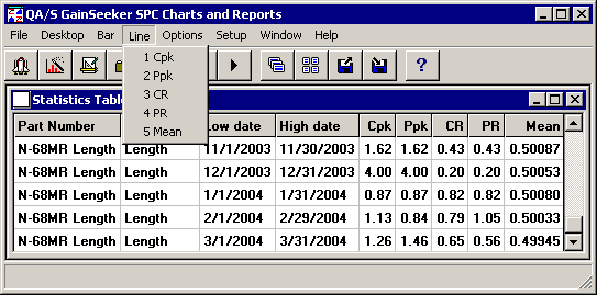 When a statistics table with rows in chronological order is displayed on the screen, the Line menu appears. From this menu, you can choose to draw a line chart of any numeric statistic already displayed in your statistics table.
