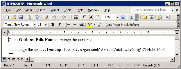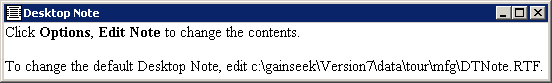 If you want to change the contents of the default desktop note, you can edit the file referenced by the Desktop Note window. The file name and location will depend on the format you chose and the GainSeeker module you are running: