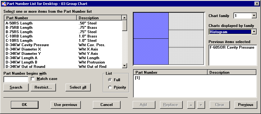 After you select the chart family, the Charts displayed by family indicates what type of chart(s) will be drawn with the new standard you choose. The Previous items selected displays the standard(s) saved in the desktop for this chart family. You can consult these two items to make sure you are changing the correct chart family.