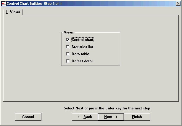 Step 3 in creating a Control chart is to select the chart view you want: a graphic Control chart, Statistics list, Data table or Defect detail list. You can create one or any combination of these four options. The default view is Control chart. (See the following screen.)