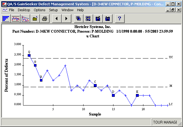 On a control chart, the defect data is plotted over time. Statistical control limits are calculated and plotted with the data.