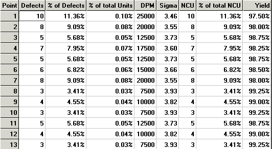 The follow table explains what information the various chart views contain. (Note: your data table and defect detail lists may differ from the following examples.)