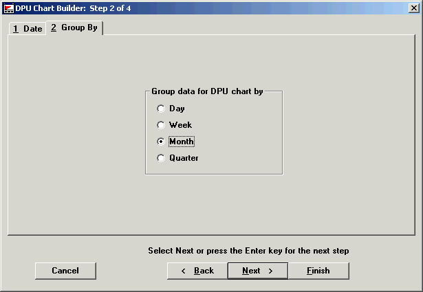 The second part of the second step in building a DPU chart is the Group by tab. This tab establishes what time period to use in grouping your data.