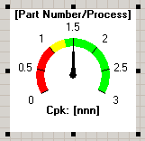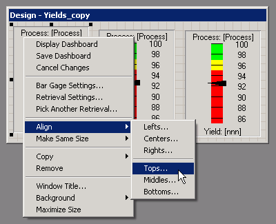 On the Design window for a KPI gage dashboard, you can drag any item to a new position on the dashboard. Menu options for aligning these items are also available.