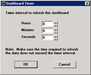 The specified time interval will begin when you click OK on the Dashboard Timer screen. After you have saved this change to the dashboard and closed the dashboard window, the time interval will begin when this dashboard is opened.