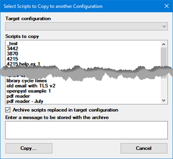 You can use the Script List toolbar buttons (below) or the Script Folders right-click menu to copy scripts to a different configuration. The folder structure for each script will be replicated in the new configuration.