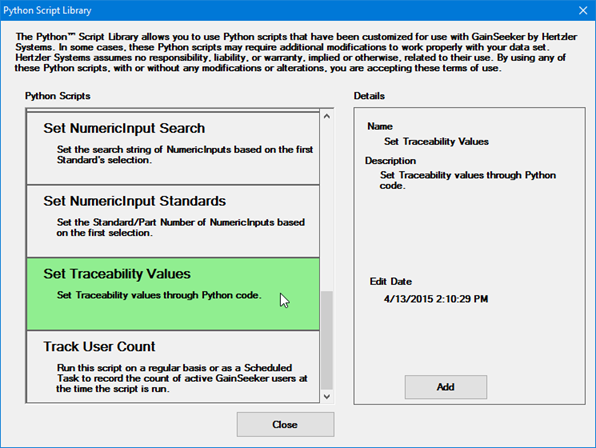 To download a sample Python script, select the script from the Python Scripts list and then click Add.