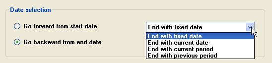 The options to End with current period and End with previous period will automatically set the end date to the end of the current or previous Period that you select (below).