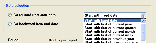 In most cases, it is preferable to choose a relative start date such as Start with first of current month or Start with first of previous month. These options will adjust the actual date periods used to retrieve data, based on the date when the user is retrieving data for the report.