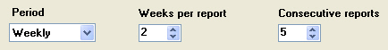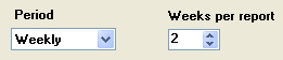 For example: to configure each date period to be two weeks long, set the Period to "Weekly" and the Weeks per report to "2".
