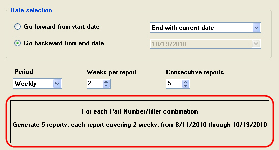 For example: to analyze data for five consecutive two-week date periods, set the Period to "Weekly", the Weeks per report to "2", and the Consecutive reports to "5".