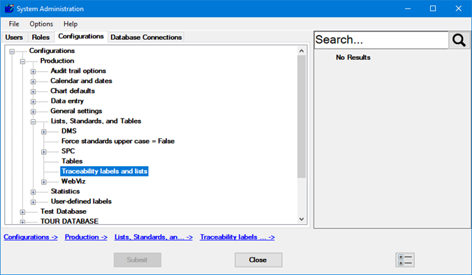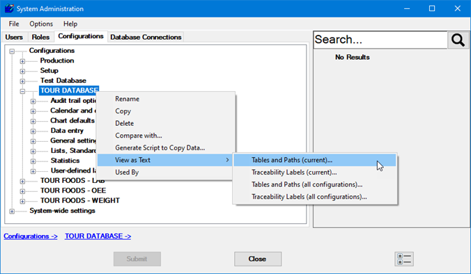 In the System Administration module, on the Configurations tab, you can display a list of the traceability labels for one configuration or for all configurations. This list can be copied to the clipboard and pasted into another destination such as a document or email.