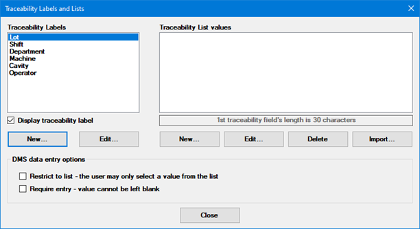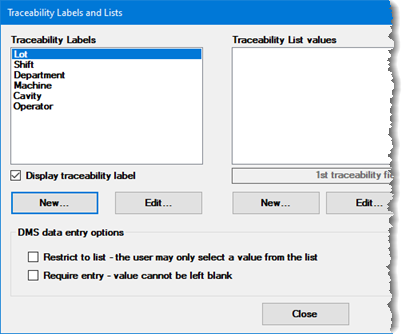 This opens the Traceability Labels and Lists window, where you can configure both traceability field labels and their predefined lists of values.