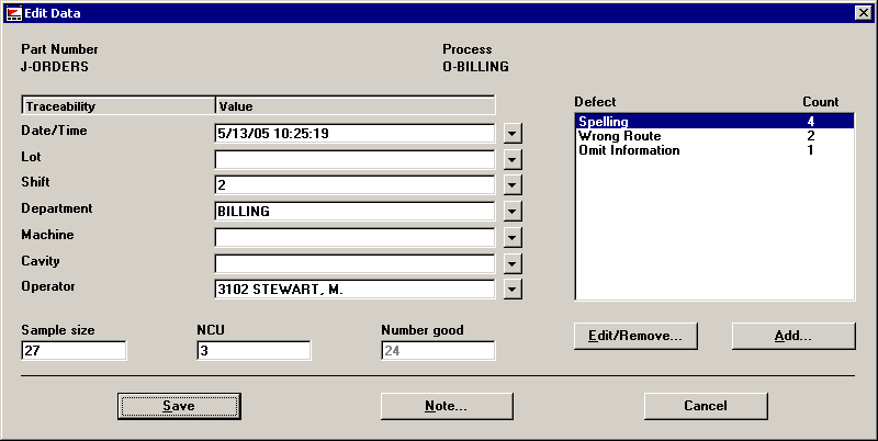 On this screen, you can enter or modify the Date/Time, traceability information, Sample size, number of Nonconforming units (NCU), and Number good just as you did on the DMS Data Entry screen.
