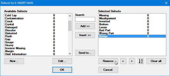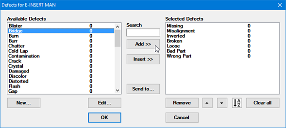 You can now assign one or more defects from the Available Defects list you created to the processes in which they might occur. In the following example, the defect Bridge is added to the list of possible defects for the process E-INSERT MAN.