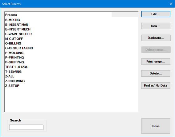 The Print range button on the Select Process dialog lets you print a report on the processes you have set up. You can select which processes and process information items to include in the report. This report is printed to your editor