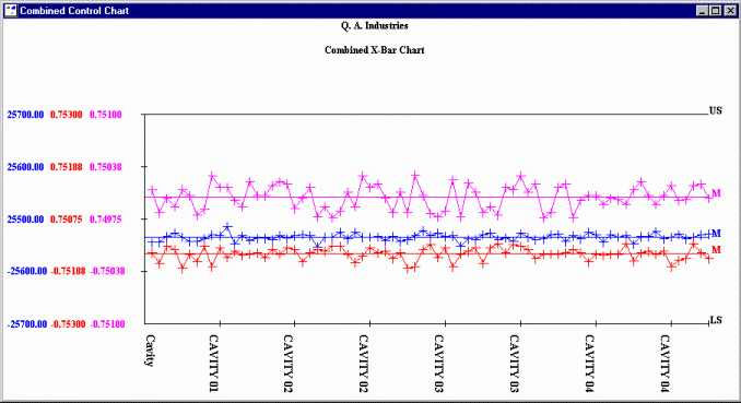 You can choose whether to display a line for the data mean on the Combined Control Chart. This line is labeled " M" on the right-hand side of the chart.
