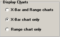 You can decide whether to display X-bar and Range charts, only X-bar charts (the default), or only Range charts. If a standard is configured for Moving Range or Sigma charts, that chart will be substituted for the Range chart.