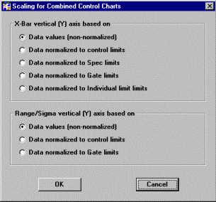 After specifying the type of scaling to use for X-bar charts and for Range or Sigma charts, click OK. This updates the cmb_control_xbar= and cmb_control_range= Cms.ini entries to make these settings the new default options for Combined Control Charts generated at this workstation.