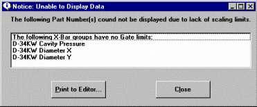 If you scale the X-bar or Range chart to Spec limits, Gate limits, or Individual limits, any retrieval group lacking these limits will be removed from the chart and listed on a message like the following: