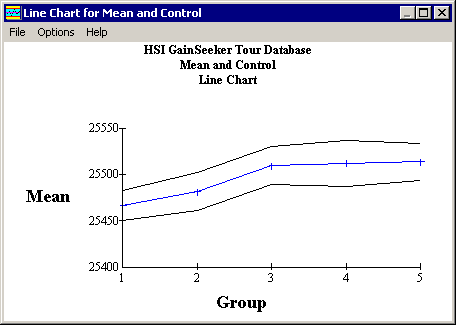 To display a line chart of the average values of the data groups, click the Send To menu, point to Line Chart and then click Mean. To display the data group control limits along with the average values, click the Send To menu, point to Line Chart and then click Mean and Control.