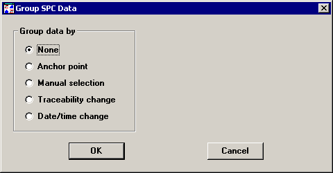 To do so, right-click on the chart and then click Group Data. Alternately, choose Group Data from the Options menu (in the SPC Charts and Reports module) or from the Chart Options menu (in the SPC Data Entry module) . This displays a window similar to the following example: