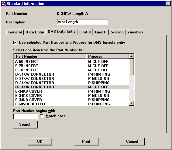 To use this feature, select the Use selected Part Number and Process for DMS formula entry check box. Then select a part number and process from the Defect Management System. When you are entering data for this SPC standard, the DMS Data Entry tab in your template will use the part number and process that you select here.