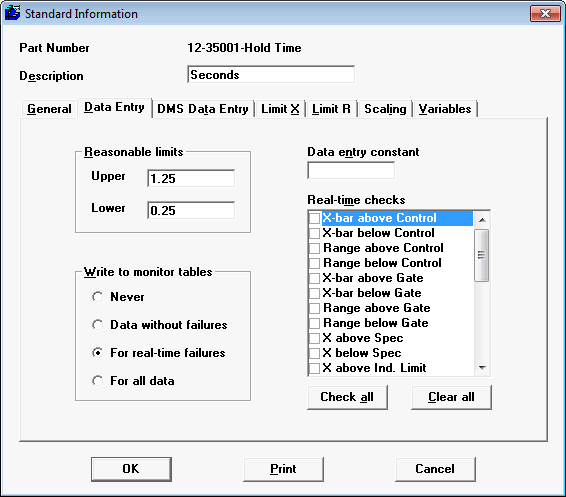 If you want to monitor this standard when it is running without failures, select For all data or Data without failures. (These options will make data entry marginally slower). Selecting For all data will store data in both the Good Data monitor and in the Failure monitor. Selecting Data without failures will store data only in the Good Data monitor.