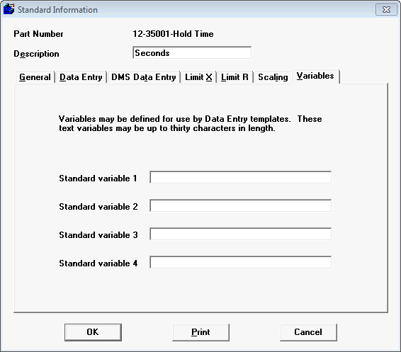 On the Variables tab of the Standard Information dialog box, you can enter up to four text values that you want to associate with this standard.