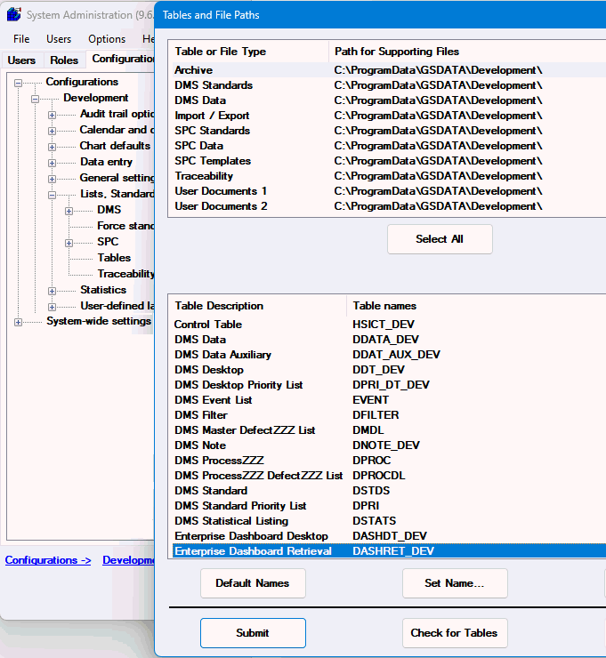 Standards tables: VSTDS, DSTDS, VPRI, DPRI, DPROC, DPROCDL, DMDL