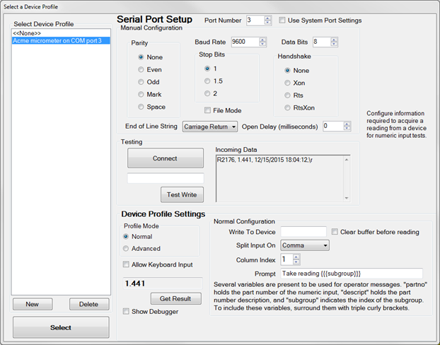 New Device Profiles for Numeric Input tests let you configure a PC Collect Inspection for RS-232 data entry without needing to write Python code: